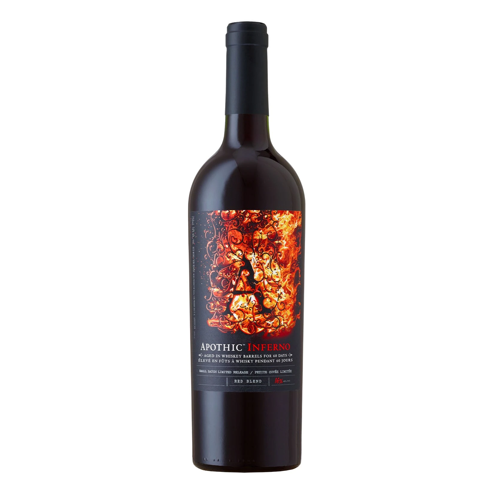 Kräftiger Blend aus Merlot, Zinfandel, Syrah, Petite Sirah, Cabernet Sauvignon. Zum Abschluss der Reifung für 60 Tage in ausgebrannten Whiskeyfässern gelagert ist der Apothic Inferno eine Klasse für sich – ein Wein mit Whiskey-Charakter! Beeindruckendes, wuchtiges Bouquet mit überaus saftiger, vollreifer Frucht, markant rauchiger Holznote und würziger Vanille. Wuchtig-feurig im Geschmack, ausgesprochen kraftvoll und vollmundig im Aroma. Kraftvoller Nachhall mit karamelligen Whiskey-Noten.