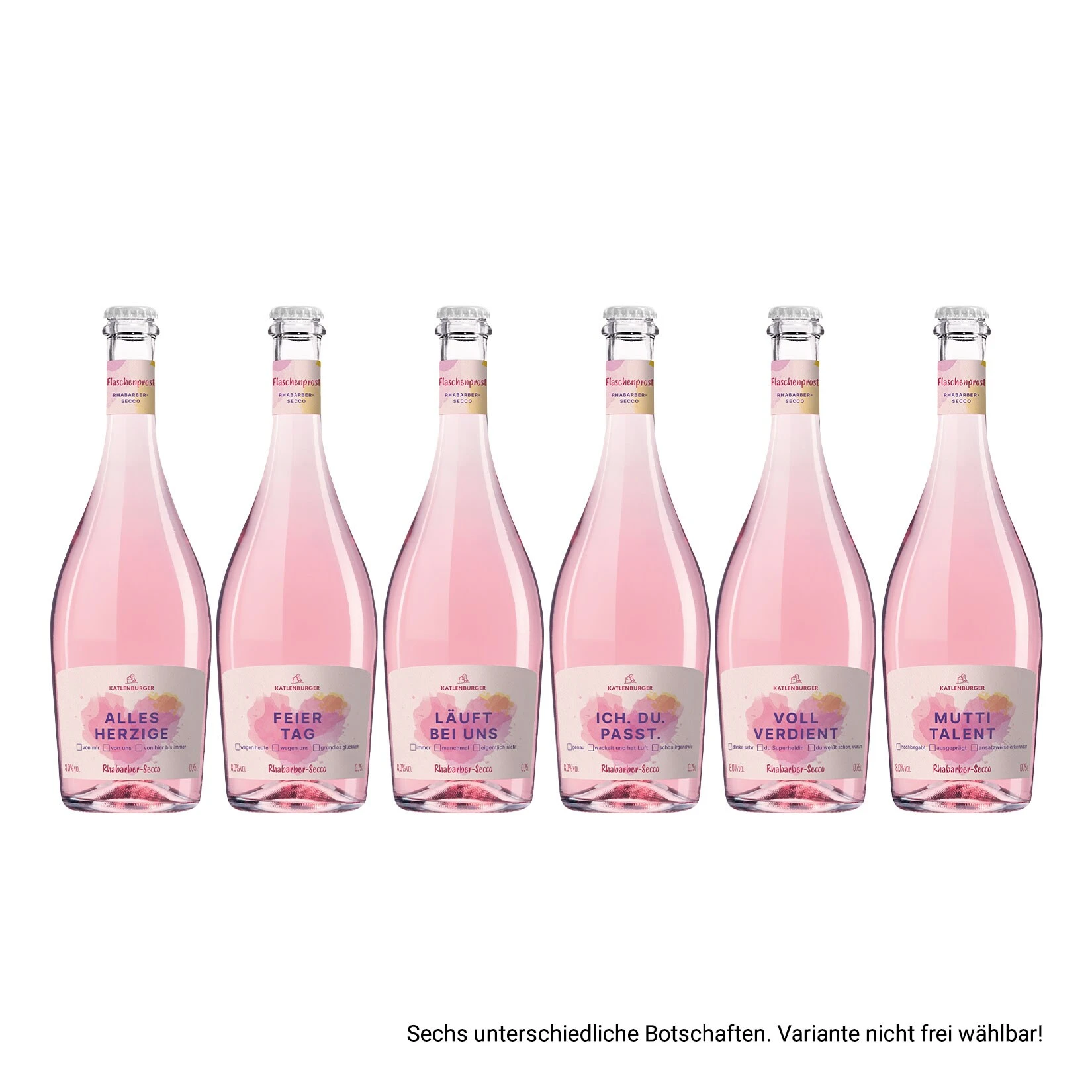 Diesen feinen Rhabarber-Secco schenkt man sehr liebenswerten Menschen oder einfach sich selbst. Sechs unterschiedliche Botschaften können durch die Ankreuzmöglichkeiten auf dem Vorderetikett individualisiert werden. Bestimme einfach selbst, wie emotional du werden möchtest. Und auf dem Rücketikett hast du die Möglichkeit zur namentlichen Personalisierung.